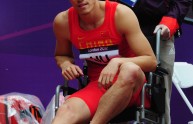 Liu Xiang sulla sedia a rotelle dopo aver superato il tragurdo on Day 11 of the London 2012 Olympic Games at Olympic Stadium on August 7, 2012 in London, England.