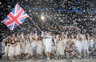 Britain’s flagbearer Chris Hoy leads his delegation as they parade during the opening ceremony of the London 2012 Olympic Games on July 27, 2012 at the Olympic Stadium in London. AFP PHOTO /POOL/ CAMERON SPENCER (Photo credit should read Cameron Spencer/AFP/GettyImages)