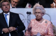 Britain’s Queen Elizabeth II (R) stands with spokesman for London 2012 Don Foster during the opening ceremony of the London 2012 Olympic Games on July 27, 2012 at the Olympic stadium in London. AFP PHOTO / POOL / MATT DUNHAM (Photo credit should read MATT DUNHAM/AFP/GettyImages)