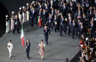 Italy’s flagbearer Valentina Vezzali (C) leads her delegation during the opening ceremony of the London 2012 Olympic Games on July 27, 2012 at the Olympic Stadium in London. AFP PHOTO / POOL / FABRIZIO BENSCH (Photo credit should read FABRIZIO BENSCH/AFP/GettyImages)