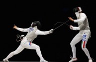 LONDON, ENGLAND – AUGUST 02: (L-R) Aida Shanaeva of Russia and Elisa Di Francisca of Italy compete during the Women’s Foil Team Fencing gold medal match on Day 6 of the London 2012 Olympic Games at ExCeL on August 2, 2012 in London, England. (Photo by Hannah Johnston/Getty Images)