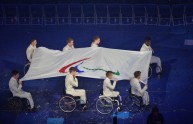 The Paralympic Flag is carried to be raised during the opening ceremony of the London 2012 Paralympic Games at the Olympic Stadium in east London on August 29, 2012. AFP PHOTO / BEN STANSALL (Photo credit should read BEN STANSALL/AFP/GettyImages)