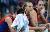 Russia’s players react after the Women’s quarterfinal volleyball match between Russia and Brazil in the 2012 London Olympic Games in London on August 7, 2012. AFP PHOTO/KIRILL KUDRYAVTSEV (Photo credit should read KIRILL KUDRYAVTSEV/AFP/GettyImages)